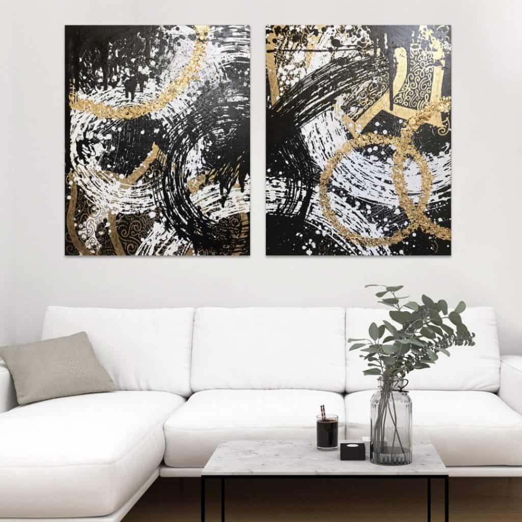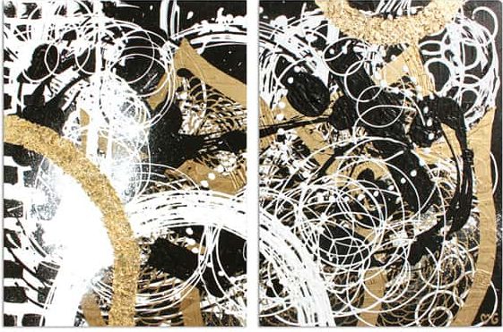 2. Glow: Each canvas 24″ H x 18″ W, acrylic, ink, and gold leaf foil on canvas (diptych), 2018.