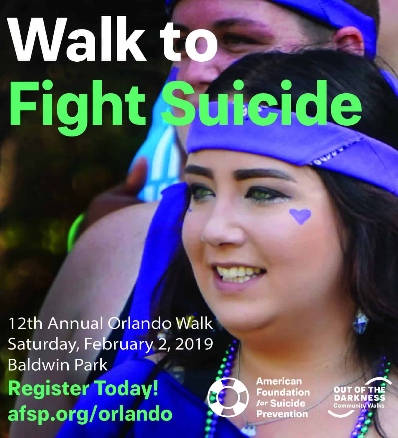 This year, our goal is to raise $150,000 and have 2,000 walkers! Please join us on Saturday, Feb. 2 at Baldwin Park, across from 2420 Lakemont Ave. Registration begins at 7:30 a.m. and opening ceremony at 9 a.m. To register, go to www.afsp.org/orlando.