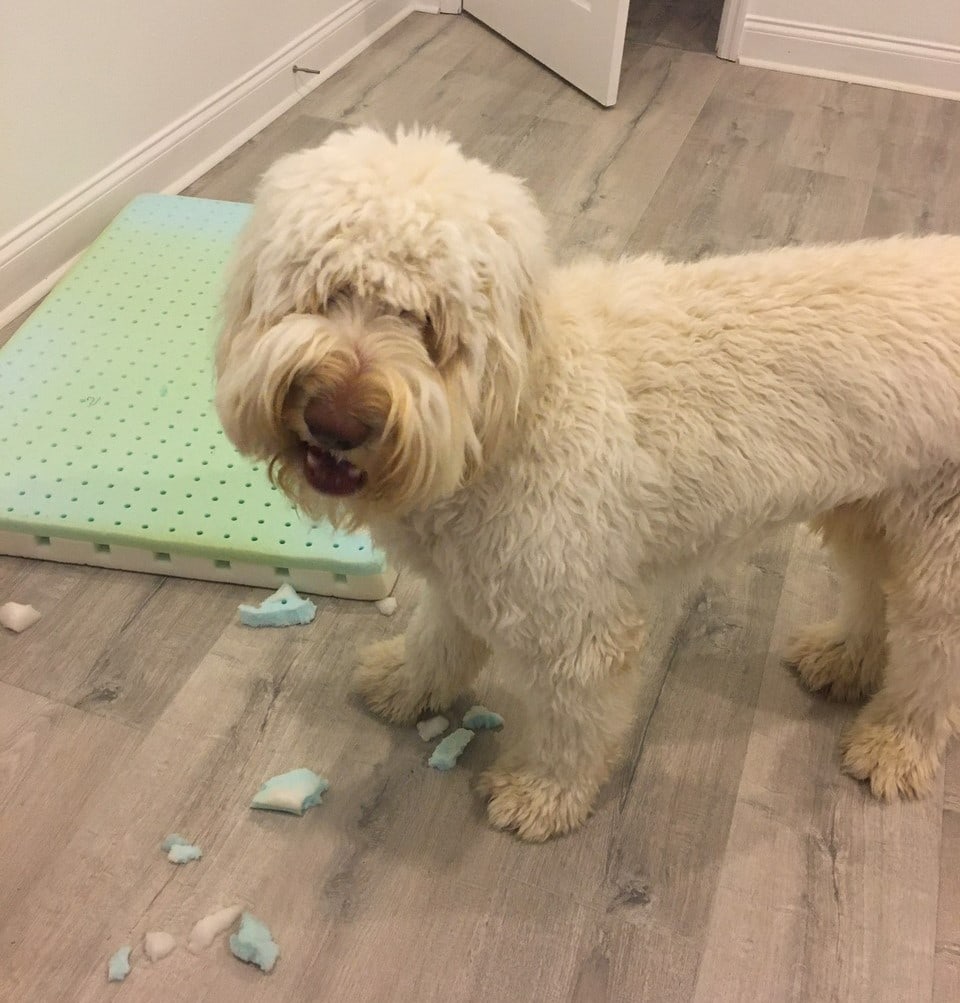Meet Tucker, the beautiful DOUBLE DOODLE! Yes, that’s correct, a “Double Doodle”! Tucker is a mix of a Goldendoodle and a Labradoodle. If you think that spells trouble, this little blessing, who is not quite two years old, decided to surprise his owners, the Brophy family, and eat his bed! As you can see by the photo, Tucker stood tall and proud after doing so! Great job, Tucker!