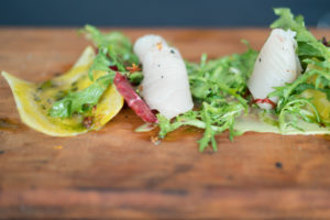 - Kolsch + Hamachi Crudo with blood orange, avocado, baby beets, frisee, and chili threads.
