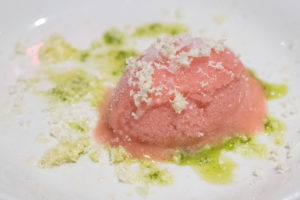 - Grapefruit Ale + Rhubarb sorbet, lemon-olive oil powder.
