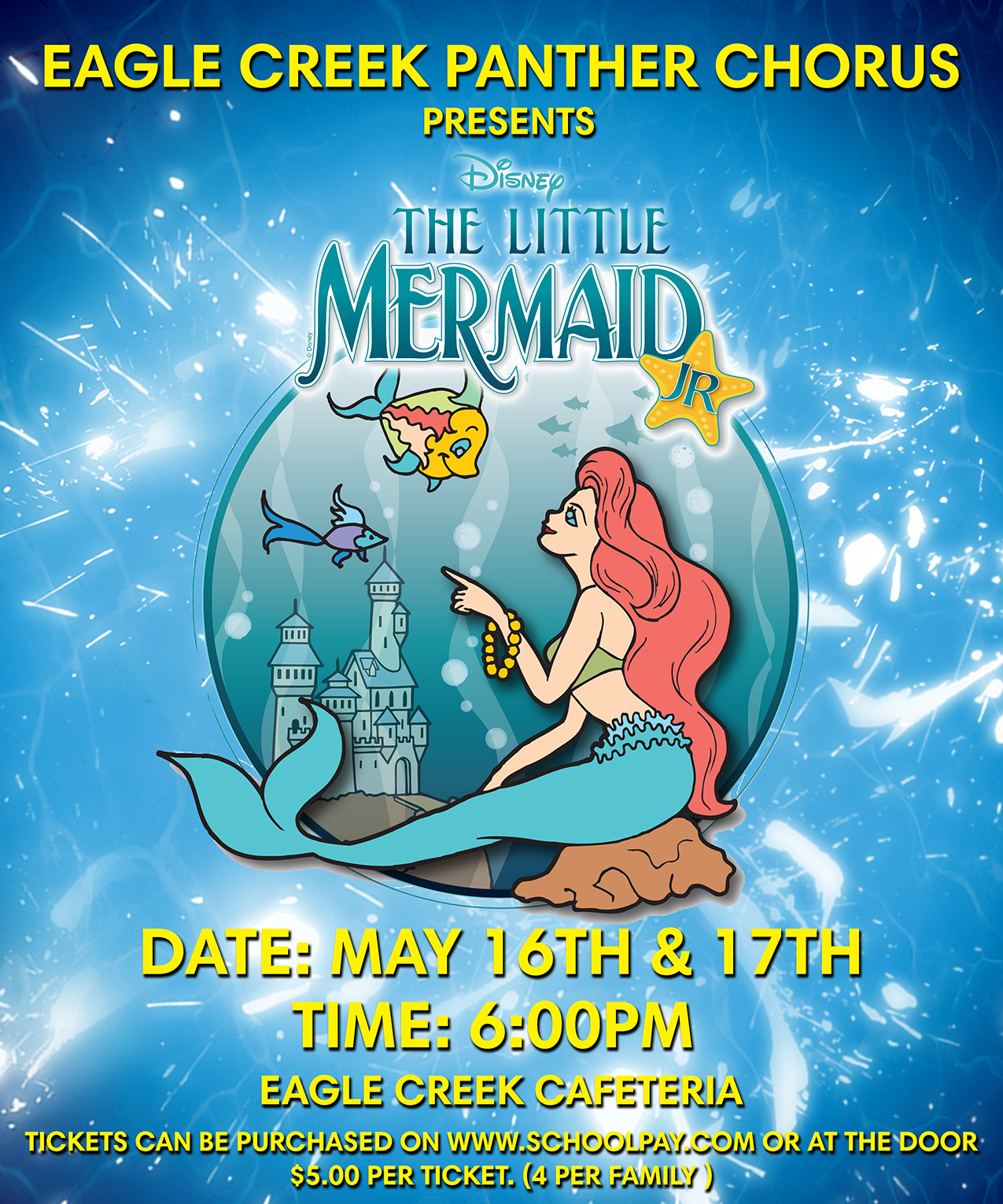 You can see our performance of Disney’s Little Mermaid Junior on May 16 and May 17 at 6 p.m. Tickets are $5.