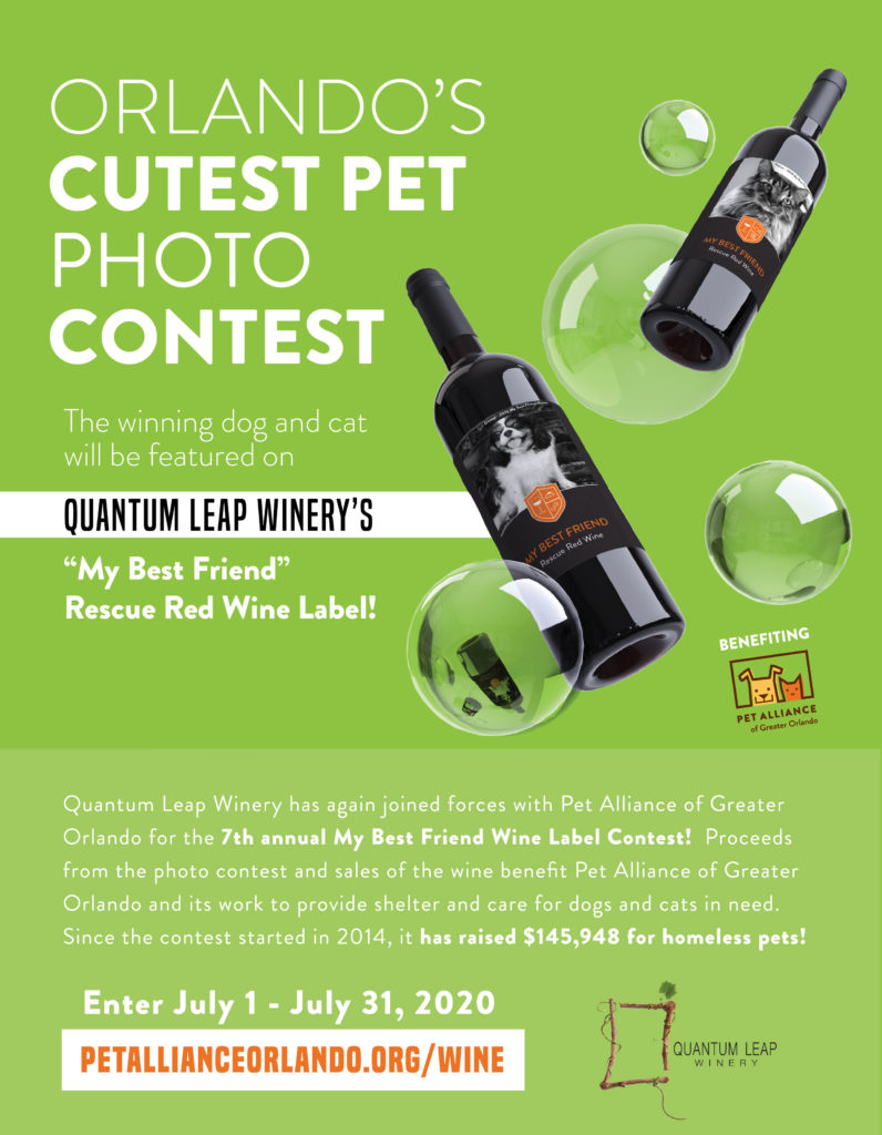 “There’s nothing our community could love more now than a dose of adorable animals,” said Pet Alliance of Greater Orlando executive director Stephen Bardy. “In return, through the ‘My Best Friend Label Contest,’ we are extremely grateful for the support our organization receives and most certainly needs to keep caring for, sheltering, and finding homes for our beloved pets in these continued trying times. We are happy to join forces again with our wonderful partners at Quantum Leap Winery, and we hope everyone gets in on the fun and enters their furry friend in our very sweet and fun contest this year.”