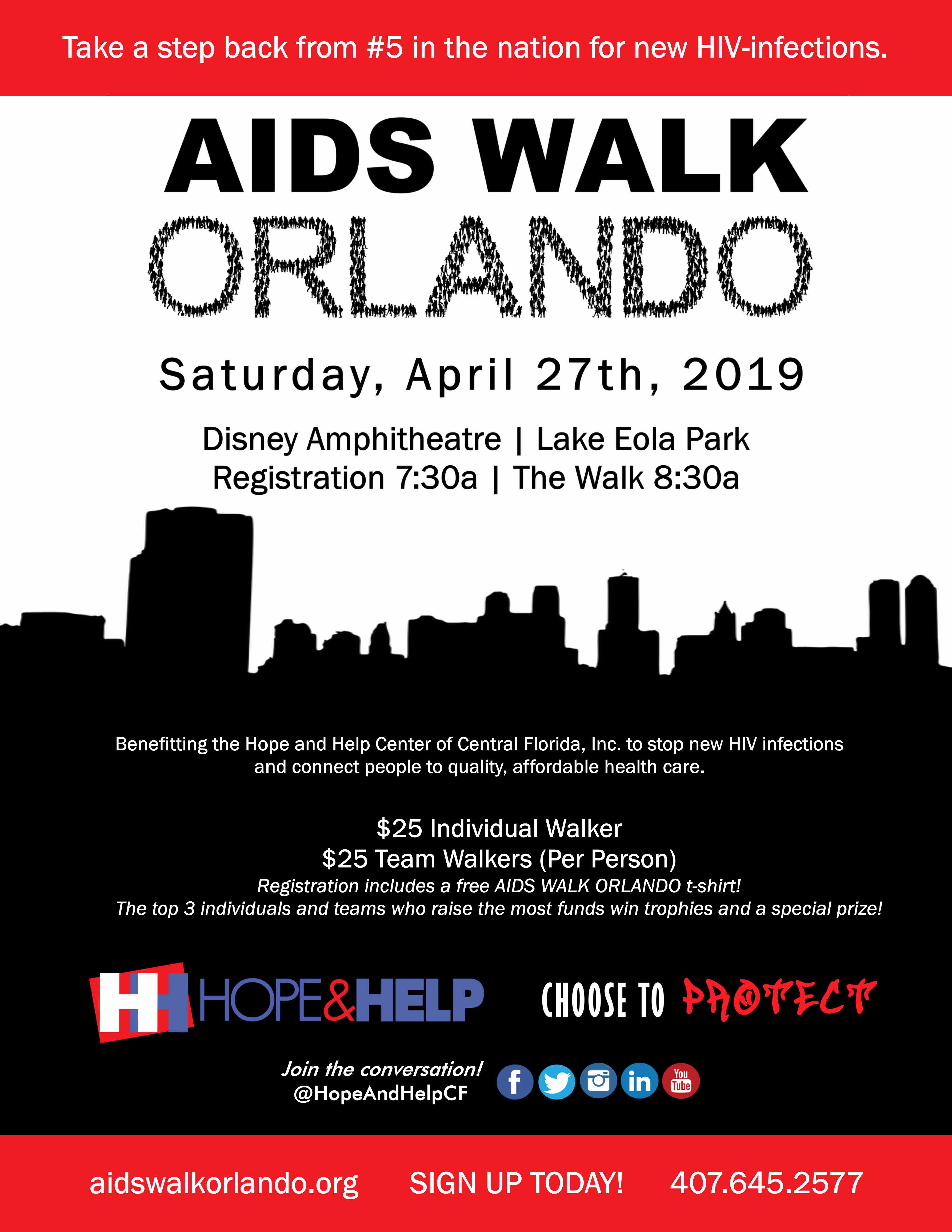 On Saturday, April 27, 2019, Hope & Help’s annual AIDS Walk Orlando will take place at the Walt Disney Amphitheatre at Lake Eola Park. The walk will benefit the Hope and Help Center of Central Florida, Inc. in stopping new HIV infections and connecting people to quality, affordable health care. With prizes and trophies, AIDS Walk Orlando creates a fun family, friendly atmosphere to raise awareness for those affected by HIV/AIDS. Walk with us to help Orlando take a step back from #5 in the nation for new HIV-infections. For more information please visit www.aidswalkorlando.org