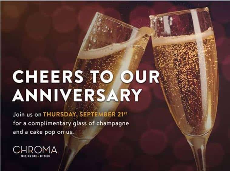 Chroma is turning one on Thursday, September 21 and they are celebrating all day long (11 a.m. – 12 a.m.) with complimentary champagne and cake pops for all restaurant guests.