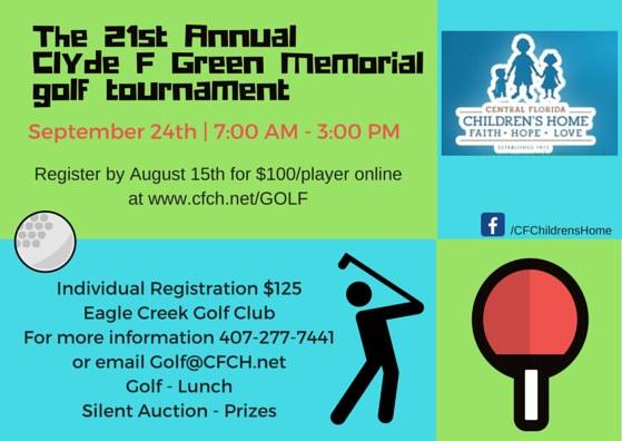 “The Clyde F. Green” Memorial Golf Tournament is a four man scramble. The proceeds go to help the kids of the Central Florida Children’s Home. You will be able to meet other people in the community that are devoted to helping our kids as well. Whether you sign up as an individual or as a group, we’re certain that you will have a great time playing.