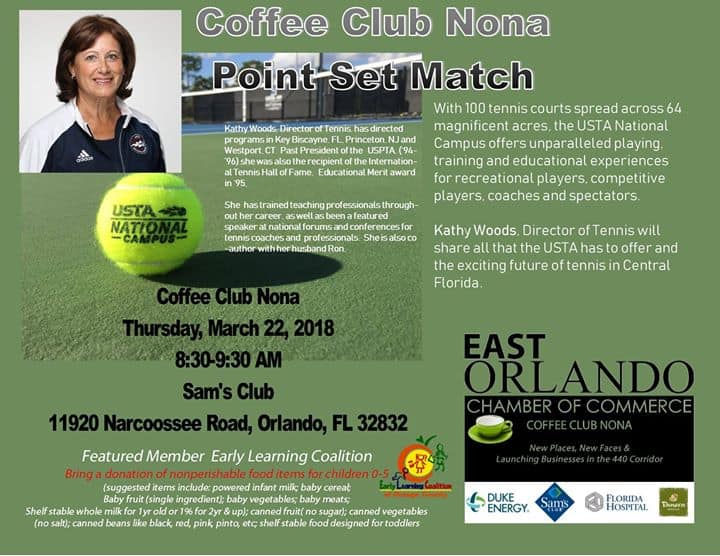 Coffee Club Nona meets the fourth Thursday of the month at Sam’s Club, Lake Nona. The featured speaker at this Coffee Club is Kathy Woods, Director of Tennis at USTA. Come out to hear her speak about the future of tennis in Central Florida and for some networking.