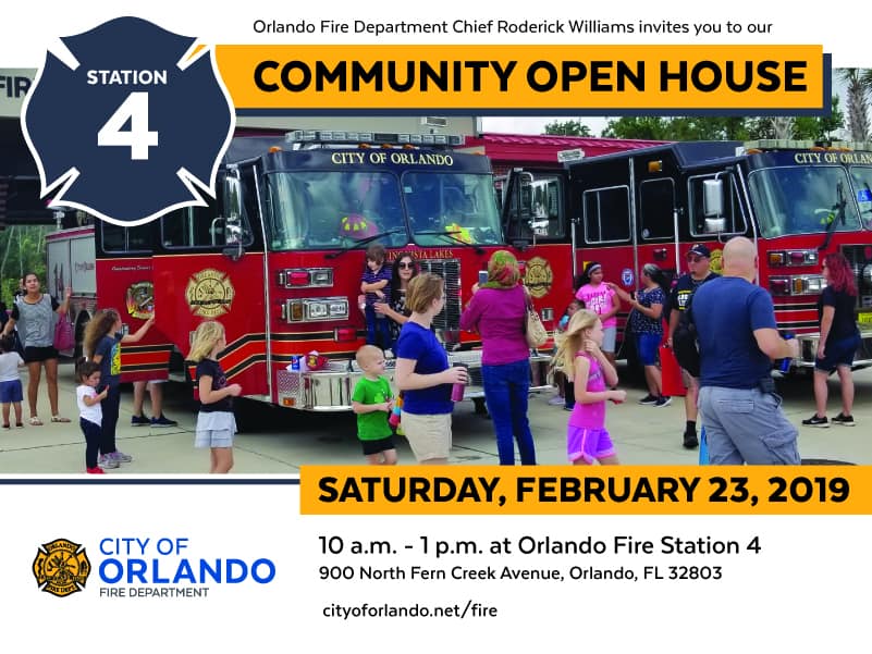 The Orlando Fire Department invites you to Fire Station Four for our Community Open House. Bring the family and meet your firefighters. Learn some vital safety tips, including Hands-Only CPR, home fire safety and blood pressure checks. Refreshments and children’s activities will be provided.