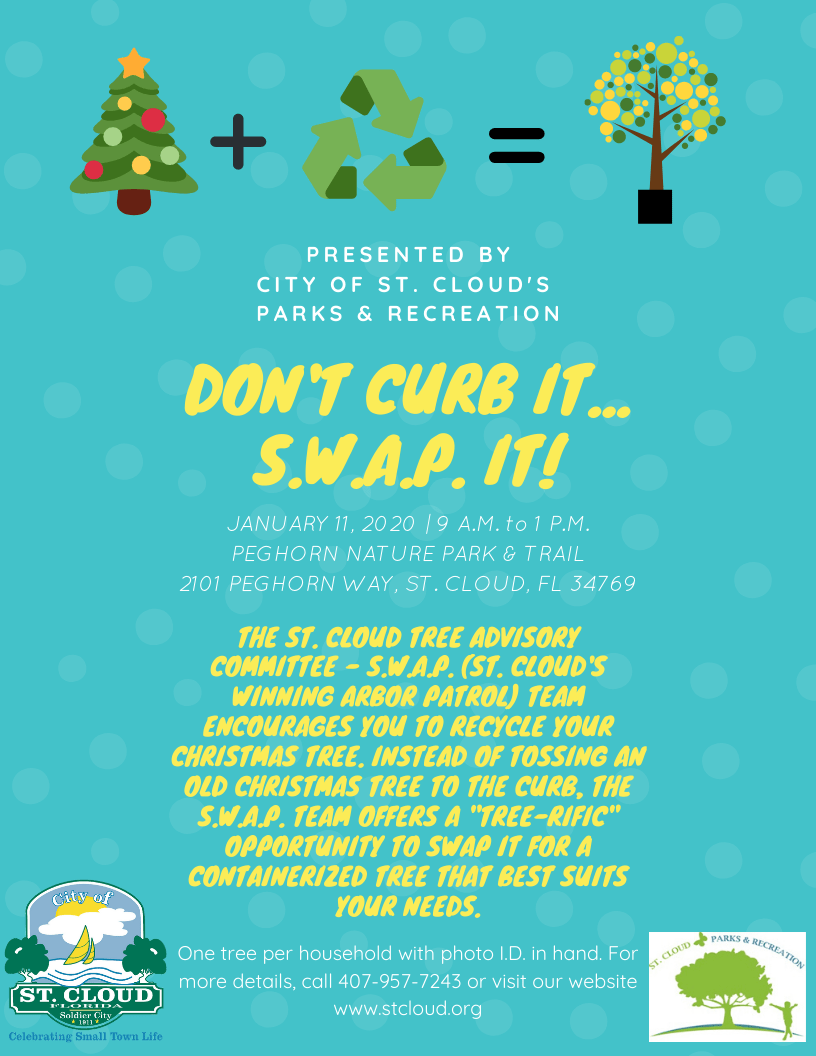 The City of St. Cloud’s Tree Advisory Committee – S.W.A.P. (St. Cloud’s Winning Arbor Patrol) team encourages you to recycle your Christmas tree towards an investment in our continued efforts to restore the Urban Forest. Instead of tossing an old Christmas tree to the curb, the S.W.A.P. team offers a “tree-rific” opportunity to swap it for a containerized tree or palm that best suits your needs. This is free event to help reduce people tossing trees to the curb and great way to get more trees planted in our community. The trees are chipped into mulch and are also given away for free at the event; it’s a win-win-win situation!