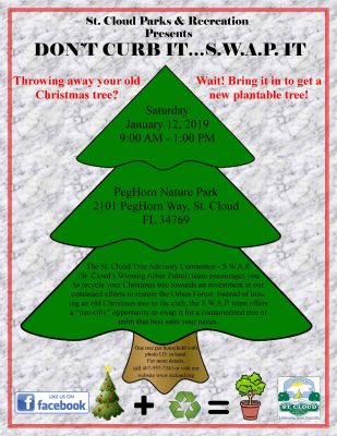 The St. Cloud Tree Advisory Committee – S.W.A.P. (St. Cloud’s Winning Arbor Patrol) team encourages you to recycle your Christmas tree towards an investment in our continued efforts to restore the Urban Forest. Instead of tossing an old Christmas tree to the curb, the S.W.A.P. team offers a “tree-rific” opportunity to swap it for a containerized tree or palm that best suits your needs. This is a free event. One tree per household with photo I.D. in hand. For more details, call 407-957-7243 or visit our website www.stcloud.org.