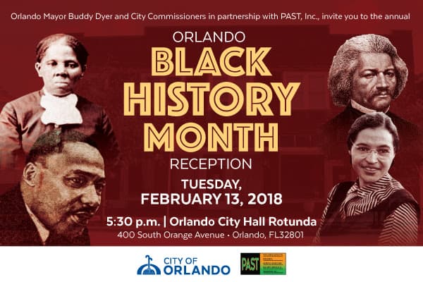 Orlando Mayor Buddy Dyer and City Commissioners in partnership with PAST, Inc., invite you to the annual Orlando Black History Month Reception on Tuesday, February 13, 2018, at 5:30 p.m. in the City Hall Rotunda.