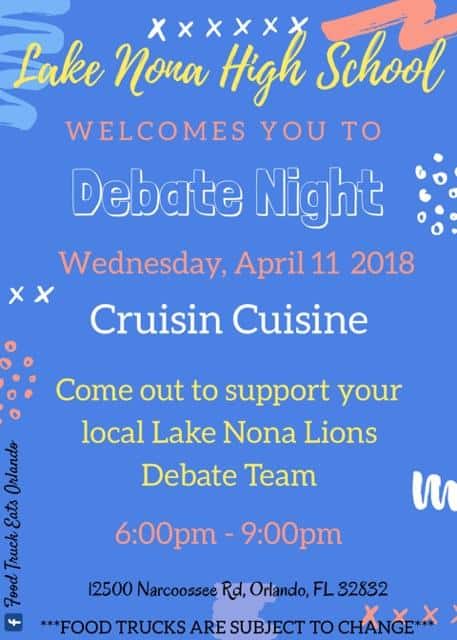 This is an event hosted by the Lake Nona Speech and Debate Club. This will be 2 hours where our debaters and orators get to showcase their talents to a wider audience. This Debate Night is different than the previous ones that we have held; this will be a Senior Night dedicated to our veteran members. A food truck will arrive at 6:00 while the actual event will take place in the media center promptly at 7:00 with an entry fee of $5.00 per person. At the end of the event, there will be a mini-reception where all attendees can enjoy cake and talk to our seniors about their experiences in speech and debate. We hope to see you there!