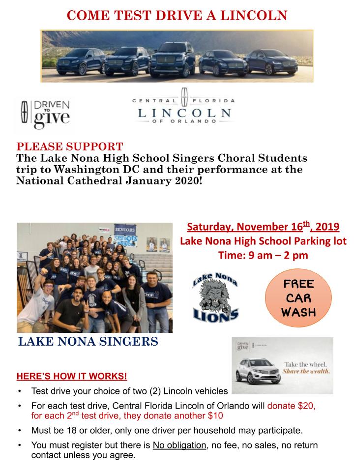 In collaboration with Central Florida Lincoln Orlando, the Lake Nona Singers from Lake Nona High School Chorus are hosting Lincoln Driven to Give – a dealership event that raises money for charitable organizations. Here’s how it works. For every test-drive taken at a Driven to Give dealership event, $20 is donated to the Lake Nona Singers. For every second test drive an additional $10 is donated. The more customers drive, the more Lincoln donates. And together, we can all give. Lake Nona Singers are raising funds for an amazing opportunity in February 2020 to sing at our nations National Cathedral in Washing D.C., touring several Universities as well as receiving master’s classes by highly esteemed professors.