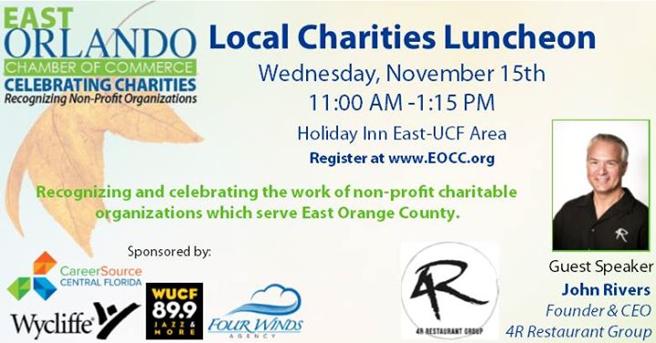 The East Orlando Chamber of Commerce Annual Local Charities Luncheon features 9 area non-profit charitable organizations who serve East Orlando. Come learn about these organizations and enjoy a Thanksgiving themed lunch while hearing from one of Central Florida’s well-known philanthropists and successful restaurateurs, John Rivers, CEO & Founder of 4R Restaurant Group.