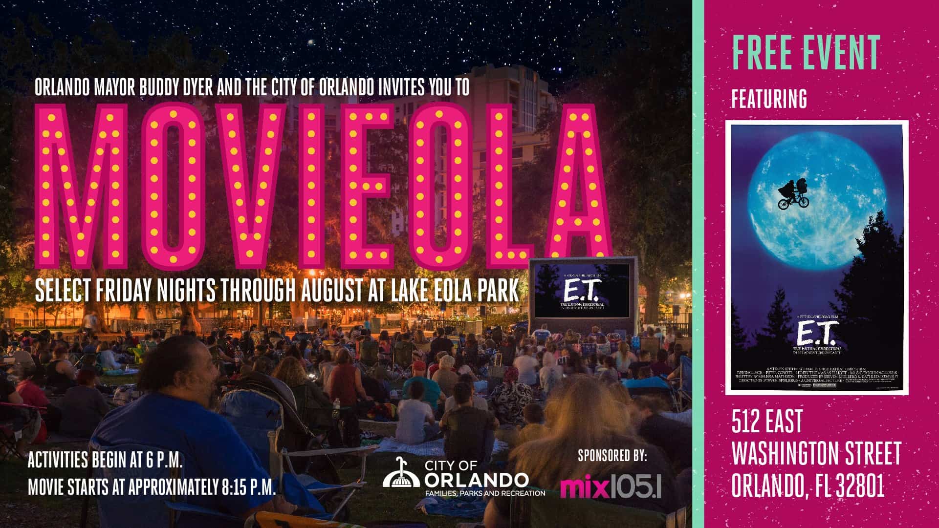Bring the family to Lake Eola Park the last Friday of each month through August for a free movie, games and food available for purchase. This month, we will be showing E.T. Activities start at 6 p.m., with the movie airing at 8:15 p.m.