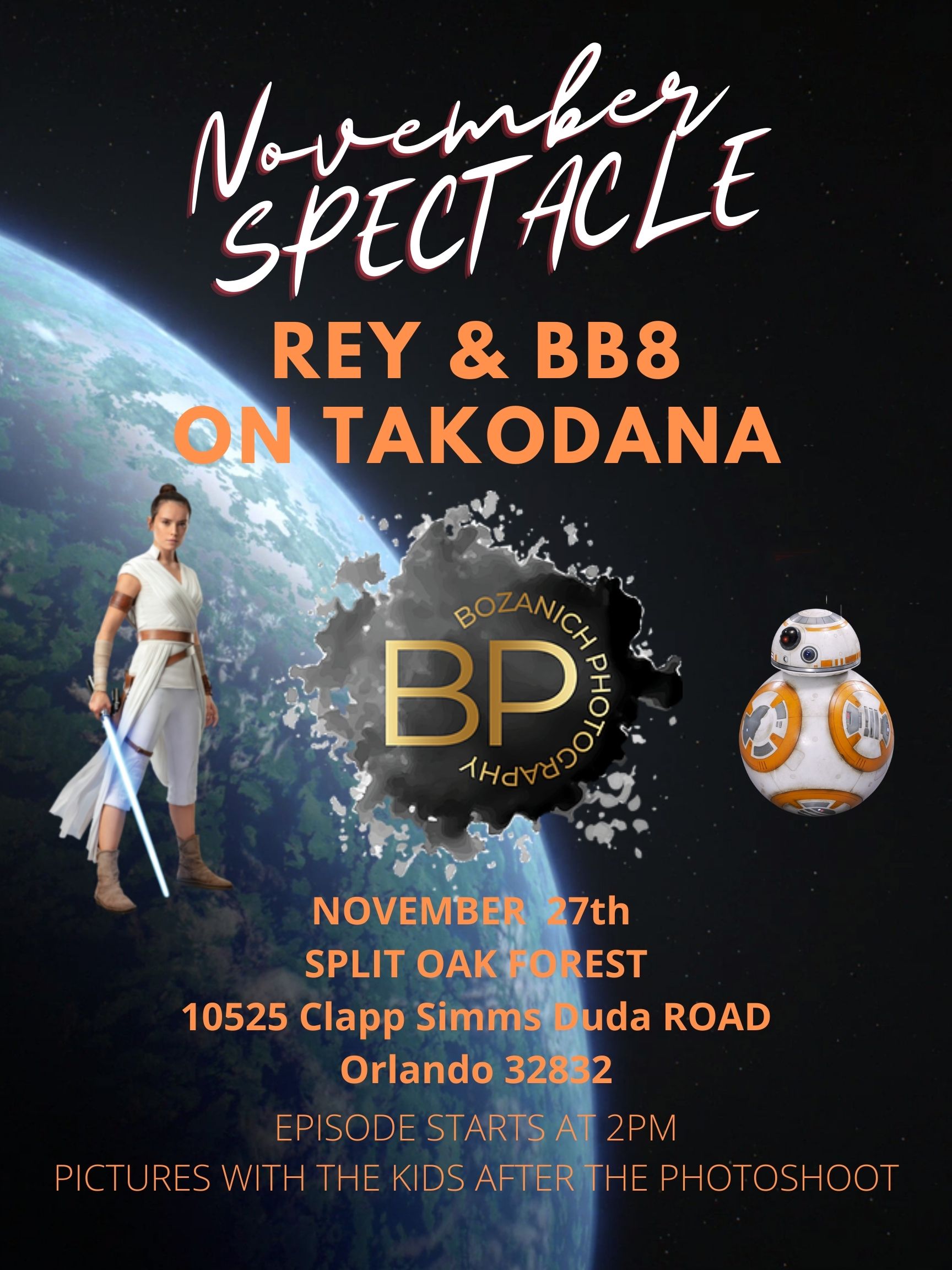 Come watch a live episode with Rey & BB8 on a forested set imagined as Takodana. Meet and take pictures after!