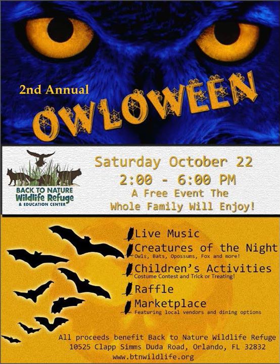 Back to Nature Wildlife Refuge will celebrate its second annual Owloween, Saturday, October 22nd from 2 p.m. to 6 p.m., complete with Halloween decorations, trick-or-treating, a bounce house, live music, a local vendor market featuring food and merchandise, an incredible raffle, pumpkin patch, children’s costume contests, extended hours to our Wildlife Walk and much, much more!