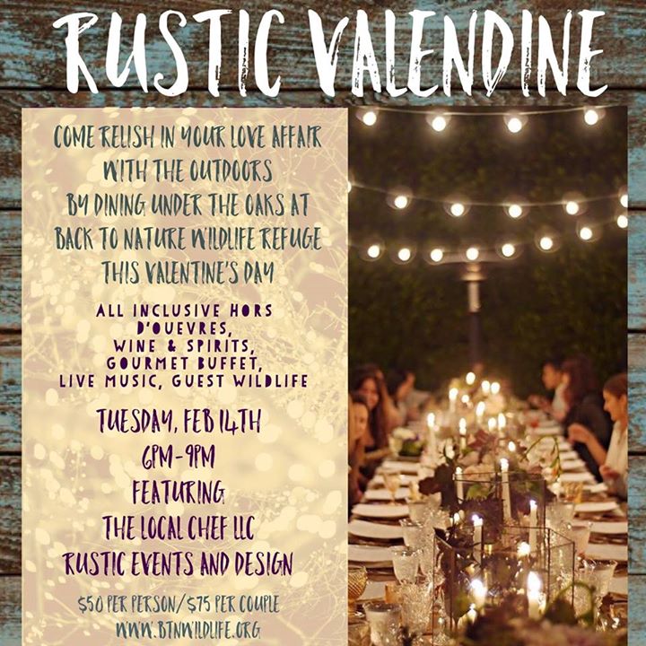Then come to BTN to dine under the stars and oaks on our beautiful, wildlife refuge. Meet and greet with some of our guest wildlife ambassadors while you enjoy a spectacular sunset cocktail hour with specialty hors d’ ouevres. Relax by the fire pit, while listening to soft, live music from violinist Brianna Shirin. Enjoy the ambient lighting and decor or take a walk on BTN’s wildlife trails before dinner is served at 7:30pm. This all-inclusive evening features a gourmet buffet by Local Chef Catering which goes hand in hand with the unique and antique, rustic decor setting by Rustic Events & Design. Reserve your seat for $50 per person/$75 per couple. Seating is limited. Tues. February 14th 6pm-9pm 10525 Clapp Simms Duda Rd. Orlando, FL 32832