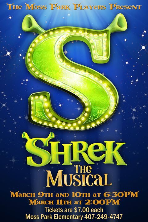 The Moss Park Players is proud to present our tenth anniversary production, Shrek, Jr.! March 9th and 10th at 6:30pm, March 11th at 2:00pm. Tickets are $7.00 at the door. We hope you’ll join us for this amazing show, featuring some of Lake Nona’s most talented kids!