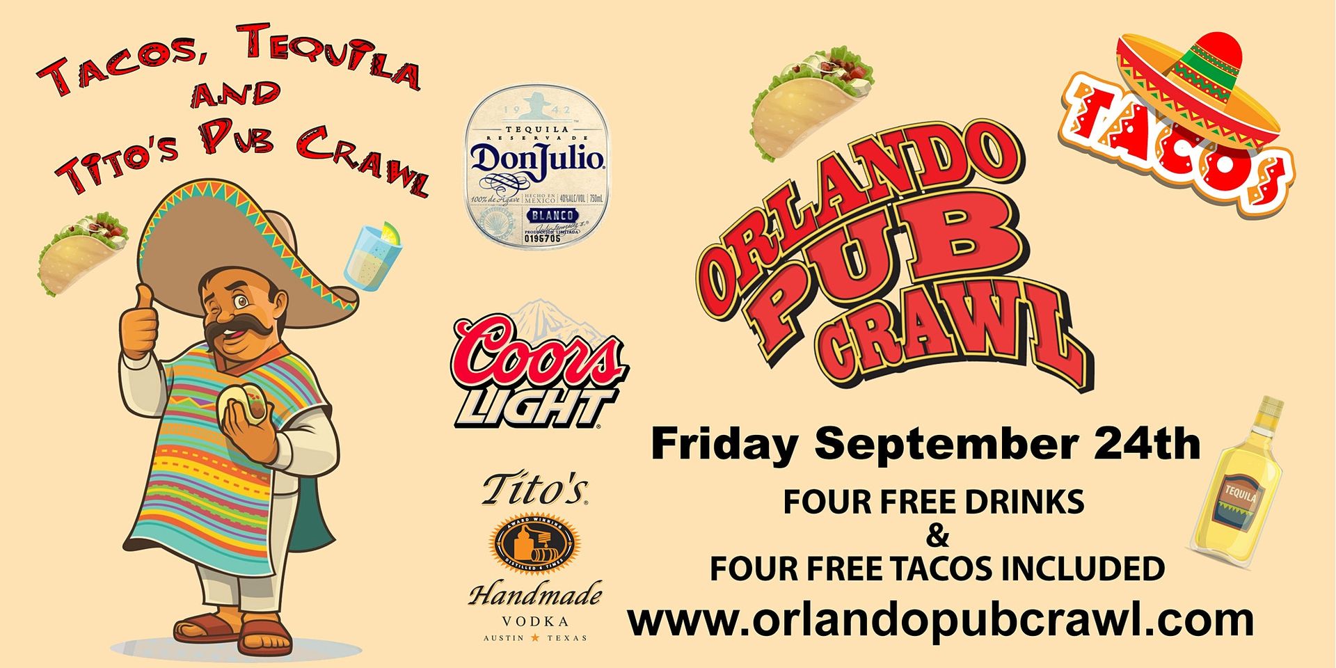 If you have crawled with us before read details carefully because this event will be completely different. 1st of all not only will crawlers get 4 free Tito’s cocktails, Don Julio tequila shots, or Coors Lights they also get 4 free full size TACOS. This event will also be FREESTYLE so crawlers check in and can visit all of the venues for tacos and beverages at their leisure. This event will also start at 5pm so bring you appetite. Don’t like meat? No worries. We will have a vegetarian option available at all venues We will have plenty of specials also. No need to dress up for this event crawler just bring an empty stomach. We are just going to enjoy Tacos, Titos, Don Julio Tequila, and Coors Light while we crawl