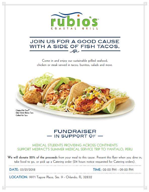 Do you love food? Do you also support global health? WELL, THEN GET HYPE! MedPACt, UCF College of Medicine‘s global health and service organization, is excited to be partnering with Rubio’s Coastal Grill for a fundraiser on Wednesday, March 21st!