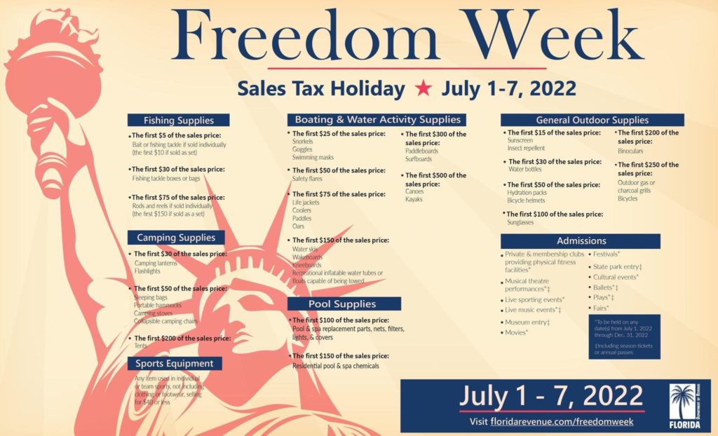 Consumers can purchase qualifying recreation and outdoor items and admissions to entertainment and cultural events exempt from tax during the 2022 Freedom Week Sales Tax Holiday. Passed by the Florida Legislature and signed into law by Gov. Ron DeSantis, the sales tax holiday begins Friday, July 1 and extends through Thursday, July 7.