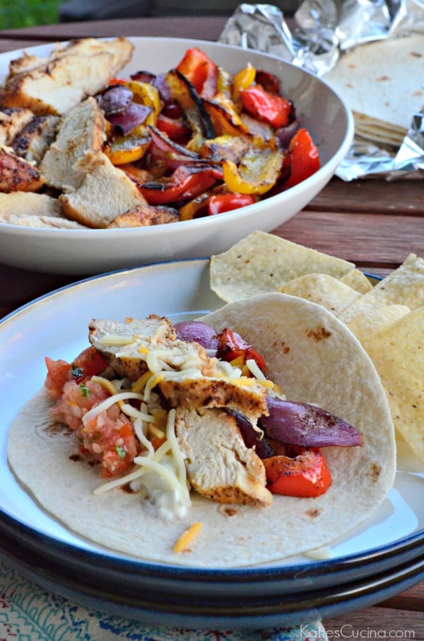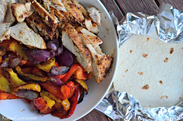If you prep ahead of time, all you’ll need to do is pull out the chicken and veggies when it’s time for dinner. Grill the chicken, place the onions and peppers in a veggie basket, and wrap the tortillas in aluminum foil. I grill everything on low on the grill, and within 15-20 minutes dinner is served! I also recommend placing the tortillas on the grill in indirect heat just before you’re ready to serve dinner (it will only take a few minutes to get them warm).