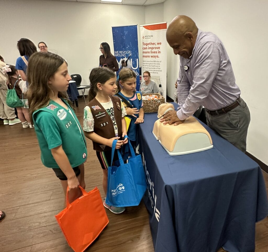 Volunteers from local HCA Florida Health hospitals, including UCF Lake Nona Hospital, showed up at the fourth annual First Aid Fair at Keiser University on July 17 to help more than 200 Girl Scouts of Citrus in attendance earn their first aid badges. The team taught Hands Only CPR, Stop The Bleed and how to call 9-1-1 to Girl Scouts of all levels, ranging from Daisy Scouts to Ambassadors, as well as their troop leaders and family members.