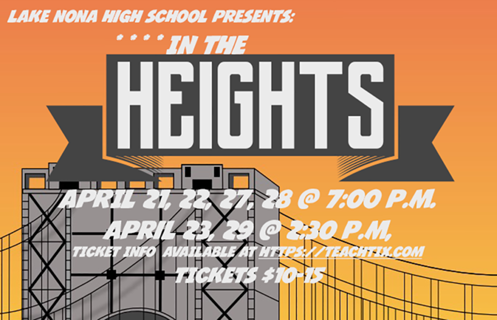 So save the date and come see In the Heights at the Lake Nona High School Auditorium. The show will run April 21, 22, 27 and 28 at 7 p.m. and April 23 and 29 at 2:30 p.m. Parking is free, and ticket prices start at $10. For more ticket information, visit https://teachtix.com.