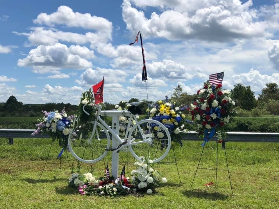 Throughout the following week, a small group of Nona Cycle members organized two events to honor David and show our respect to the McGrinn family. The days passed by in a surreal whirlwind of on-the-fly planning; member Matt Rought suggested we place a Ghost Bike memorial at the site of the crash, and within a matter of days, we had approval from the Greater Orlando Aviation Authority to do as we wished. Matt and Dovi acquired a bike and transformed it into a Ghost Bike, then prepared the site where it would be placed. We chose the morning of Saturday, Aug. 3, the week following the crash to cycle the same Airport Loop to install the memorial.