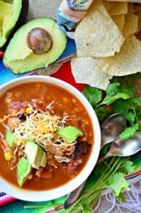 To add an additional layer to the Chicken Tortilla Soup, I like to add freshly diced avocado and a handful of shredded Mexican blend cheese. Of course, a good sharp cheddar would work, too! If you have fresh cilantro on hand, you can dice that up as well, and if you really want to get crazy you could add in a dollop of Greek yogurt or sour cream. Don’t forget the tortilla chips, either!