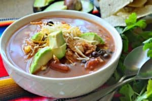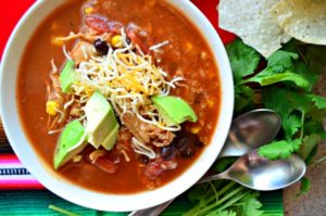 - Ladle soup into bowls, top with shredded cheddar cheese and fresh avocado slices. Enjoy with tortilla chips!