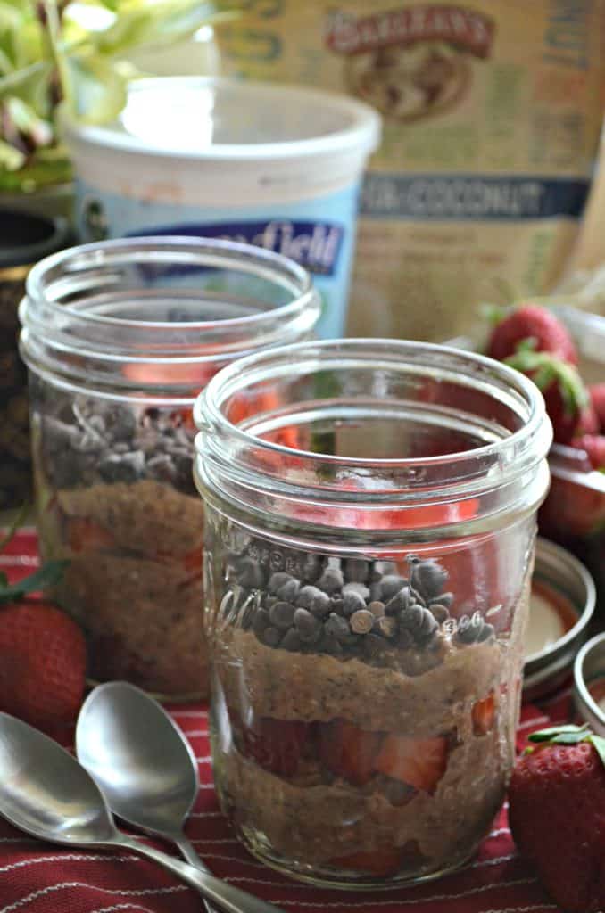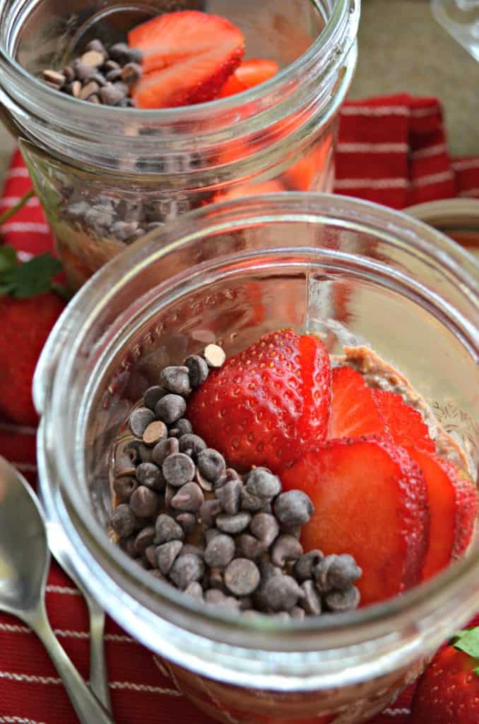 - Top each jar with additional strawberries and 1 tablespoon of mini chocolate chips per mason jar. Place in refrigerator overnight and enjoy the next morning.