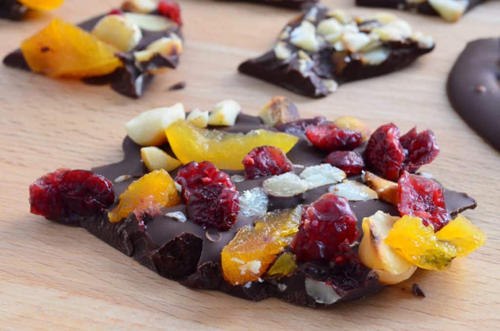 For this recipe, I use macadamia nuts, dried apricots, and dried pomegranates. They all complement each other perfectly. Once your bark is done, you’ll need to place the tray in the refrigerator for 30 minutes to set. Once the chocolate has set and is hard, you can break up the bark. Multiple methods here: my method of choice is breaking it with my hands. However, you need to work very quickly so it doesn’t melt. You don’t realize it, but your hands hold heat, which will melt the chocolate. You also can take a knife and carefully stab at the tray, breaking up the bark. You can package it in cellophane bags, in a tin, or place it on a plate.