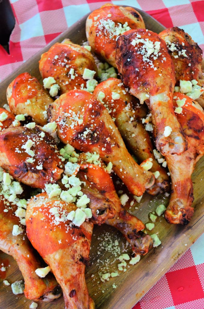 Summer is right around the corner, and as our weather officially starts to feel like summer, this also means my mind has officially entered grilling season. We are lucky to be able to grill year-round if we desire, too. I know I can’t be alone in that there is just something about the summer heat that has me grilling most meals instead of turning on my oven. I like to grill a wide variety of entrées so that no one is burned out on hamburgers and hotdogs. Grilled Buffalo Chicken Drumsticks are the perfect, easy summertime grilled lunch or dinner. They are packed with protein, marinated in spicy buffalo sauce, and topped with blue cheese crumbles – all the flavors you usually love in small chicken wings but in a larger drumstick form.