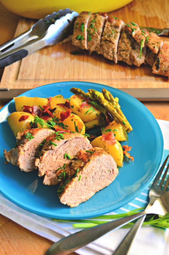 - Place the pork in the pan and cook for 3 minutes. Turn the pork and add the potatoes, green onions and asparagus. Place the lid on the cast-iron pot and place in the oven for 20 minutes. The pork should read at least 145 degrees Fahrenheit. Remove the pork from the pan, let it rest 5 minutes, then cut diagonal. Sprinkle bacon and parsley on top of potatoes and asparagus. Divide among 4 plates and enjoy.
