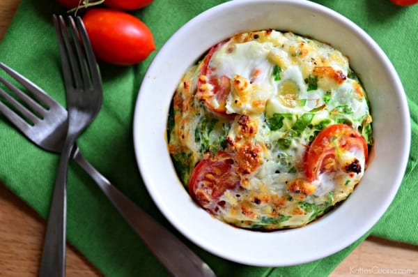 Spring for me is all about brunching. One of the biggest days we brunch is for the mothers in our life. I’m so excited to share with you my easy and healthy recipe for Tomato, Spinach and Feta Egg White Soufflés. This recipe, in my mind, is the perfect healthy and delicious recipe to make for Mom. It’s pretty “no fuss” and very hard to mess up! I created this recipe a few years ago when I had an abundance of grape tomatoes in my garden. I started adding tomatoes to just about everything. I’ve always eaten egg whites since I can remember, so it was a given I would make some sort of egg white soufflé recipe, and that’s how this recipe was created.