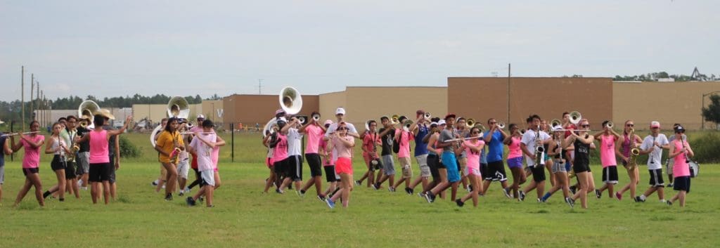 The second week of band camp includes all band students. This is where the fun begins! The days are long, but the friendships made last forever. During band camp, the students start their day outside learning marching fundamentals and the new halftime show. After enjoying a healthy catered lunch, they move inside for music and section rehearsals. Dinner also is catered, after which the students go back outside to continue working on the marching portion of their show.
