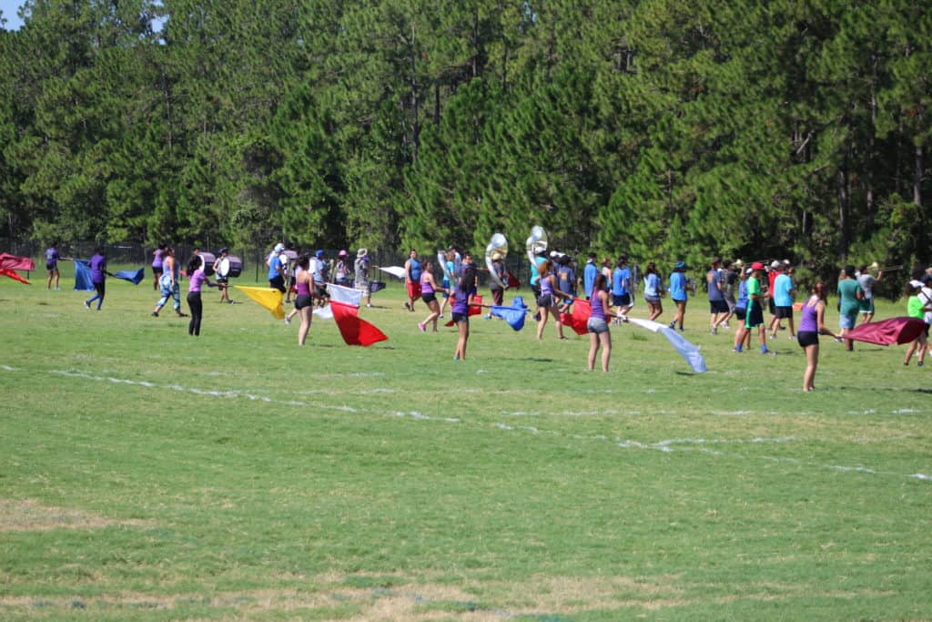 Band camp starts at the end of July with Leadership Camp. Student leaders attend Leadership Camp, which is designed to teach them about peer teaching and leadership skills that will prepare them for their roles in the band program. They also set goals for the year and participate in teambuilding exercises. After two days of this camp, the band welcomes in the new members and freshmen for another two days of training. They spend this time working intensively with the leadership team to learn marching and playing fundamentals for high school.