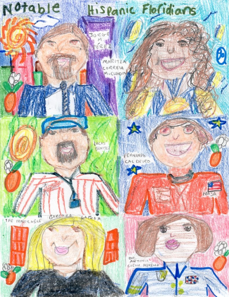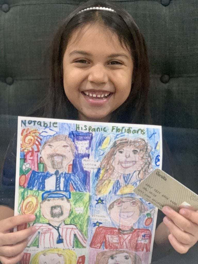Students could submit drawings or write essays for the contest. Since Eden loves to draw, for her submission, Eden used markers, colored pencils, and crayons to create a picture she titled “Notable Hispanic Floridians.” Eden and Ashley talked about Eden’s Mexican and Honduran heritage and how Latinos and Latinas like her make impactful contributions to the state. After doing a bit of research with her mother, Eden decided to draw the following prominent Floridians: United States Circuit Judge Barbara Lagoa; billionaire real estate developer, art collector and philanthropist Jorge M. Pérez; Olympic swimmer Maritza Correia McClendon; Lucas Benitez, co-founder of the Coalition of Immokalee Workers (CIW) and leader in the fight to end the exploitation of American farmworkers; Fernando Caldeiro, the astronaut appointed to serve in the President’s Advisory Commission on Educational Excellence for Hispanic Americans; and Dra. Antonia Coello Novello, the first woman, first person of color, and first Hispanic U.S. Surgeon General. For her drawing, Eden won a $250 gift card and a goody bag from the Florida Lottery.