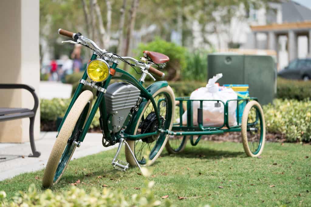 To make the trailer more like the bike aesthetically, we asked Vintage Electric for their powder coating color code and sourced some spray paint to match. We removed and treated the trailer’s bamboo slats with tung oil and re-riveted the slats back to the frame. We painted the wheels to match those on the bike and sourced creme 20×1.75 tires also to match those on the bike.