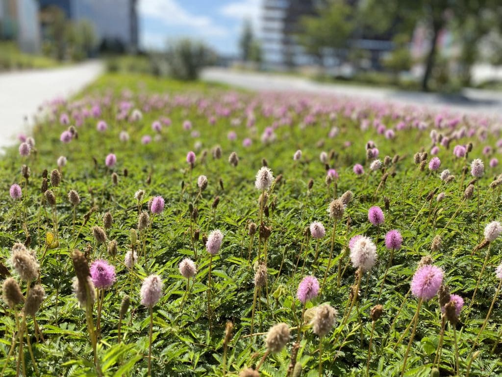 In the Lake Nona Sculpture Garden, nearly 300 hand-selected, Florida-grown palm trees joined the Lake Nona ecosystem providing habitats for birds like grackles, wrens and cardinals. In addition to the palms, the garden features climbing vines, fragrant shrubs including ylang-ylang, gardenia and night-blooming jasmine that will bloom seasonally. Beyond the Sculpture Garden, the surrounding meadow features a mix of native plants for pollinators, including wildflowers and the Powderpuff Mimosa – a versatile groundcover plant that blooms all summer long with cheerful pink flowers.