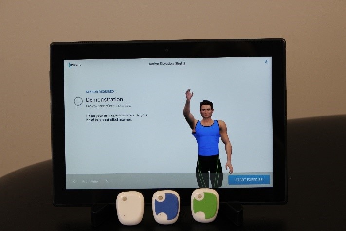 PT Genie is prescribed by a healthcare provider to give the patient an on-demand experience so they can do therapy on their own time, following a rehab protocol designed by their doctors from a library of more than 400 exercises. The patient wears digital sensors as they follow specific exercises on a screen, and the data is saved in a cloud-based system where the patient, doctor, and physical therapist can track the progress.