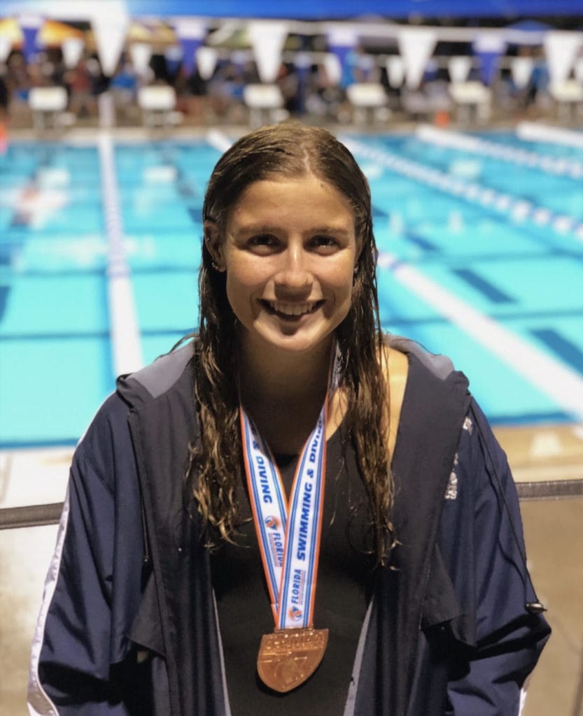 The passion for swimming is evident in Agliano’s regimen. She very much looks forward to practice and sets her sights on all kinds of aquatic goals, like state records for various strokes and state championships. We’ll be seeing many more Olympic Trial qualifications from her in the future. Remember her name and look out for this Lake Nona girl making a big splash!