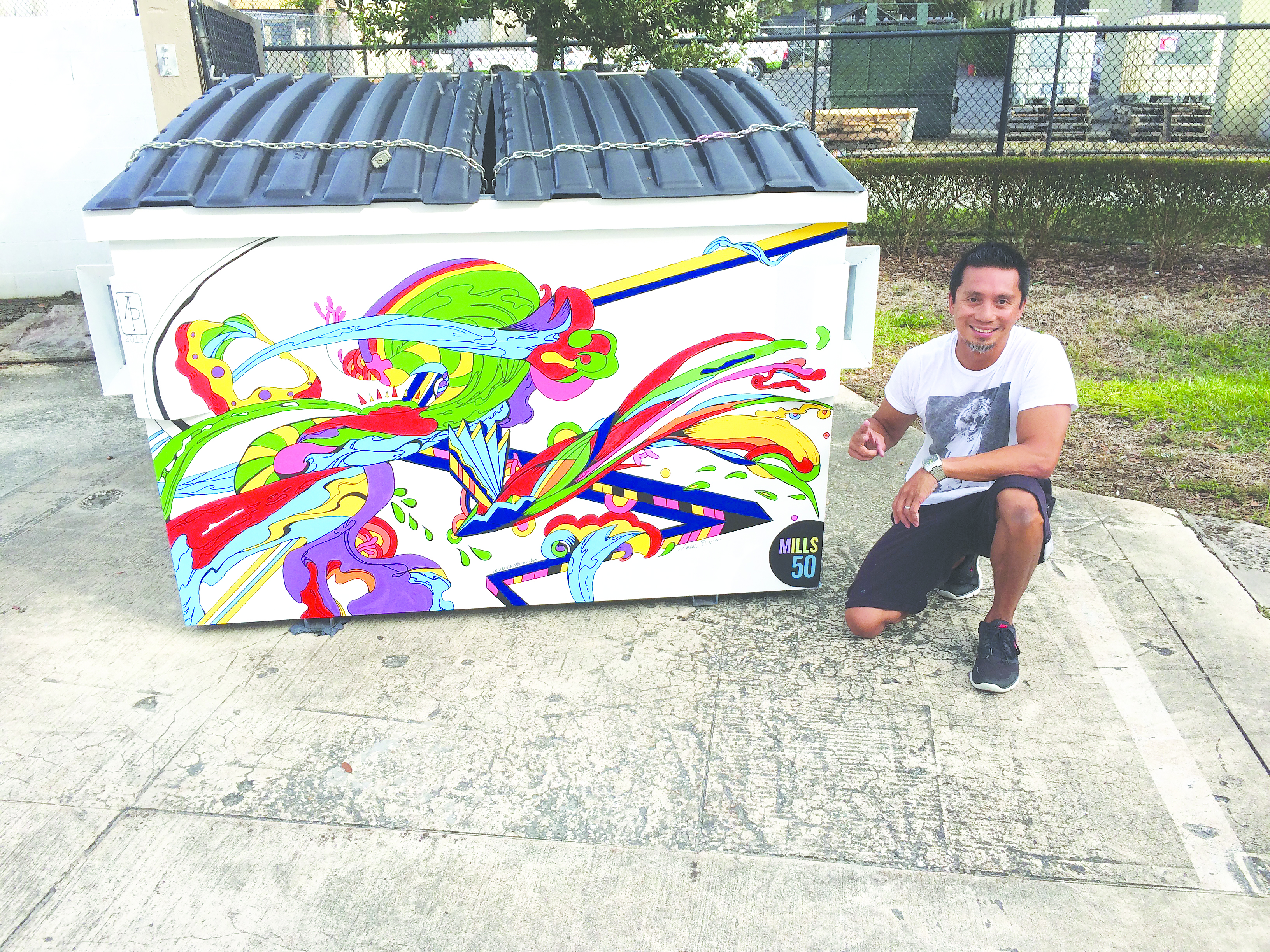 While painting the dumpster, Arnel quickly found out that he was embarking on a new artistic journey. “I started painting it and I never painted outside before …it was horrible; the paint just didn’t work! I just got the wrong paint and that paint just didn’t work, so each one of those abstract shapes is four layers of paint… it took four weekends,” Arnel said. When he was done, Arnel won the contest and was selected to be on the cover of a calendar featuring all of the dumpsters included in the contest.