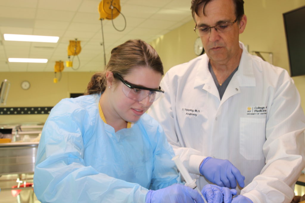Before studying in the lab, nursing students watched a videotape about the experience and the impact of their patient’s gift to medical education. At UCF’s medical school, cadavers are considered the student’s first patient. Medical students talked to their nursing colleagues about honoring and respecting the person’s gift to their training. Pruitt will be analyzing the impact of the experience in a research study and hopes his results will help make the program a staple for UCF nursing students.