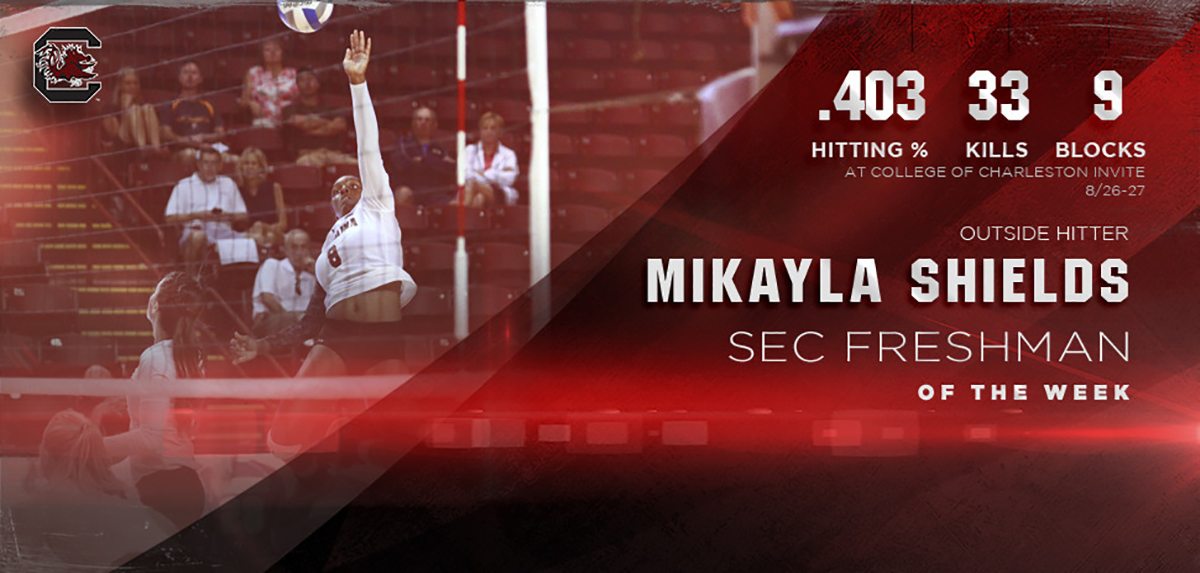 COLUMBIA, S.C. – The first Southeastern Conference weekly awards were released for volleyball Monday (8/29/16) afternoon, and outside hitter Mikayla Shields was recognized as the Freshman of the Week after earning MVP honors at the College of Charleston Invitational. Shields is the first Gamecock to earn SEC weekly honors since Aubrey Ezell in October of last season.