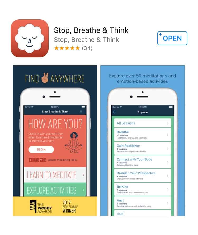 The name of this app is spot on with what it promises and delivers. The first thing you see when you open Calm is a home screen that says “take a deep breath” – such a simple but lovely reminder. Calm lets you choose a scene from a variety of calming backgrounds with or without sound. You will see a Daily Calm and Featured Story on your home page, which you may access for a subscription fee. There are, however, several alternatives within Calm that are free. The Breathe option helps you practice controlled breathing by creating your own “breath bubble.” It lets you set a number of breaths per minute and a breathing pattern that includes in-breath, out-breath and breath retention. Then, it gives you a graphic representation of the breath pattern you selected so you can follow along. Meanwhile, it tracks the time spent on monitoring your breath. The Meditate option offers guided meditations that vary in focus and length. Finally, a Sleep Story is an option for guided meditation created specifically to assist in transitioning to sleep. Your profile on Calm tracks your longest streak in days meditating, the time you’ve spent in meditation and the total number of sessions you’ve had. A helpful feature is the ability to add a Mindfulness reminder at a desired time to help you stay on track with your mindfulness practice every day.