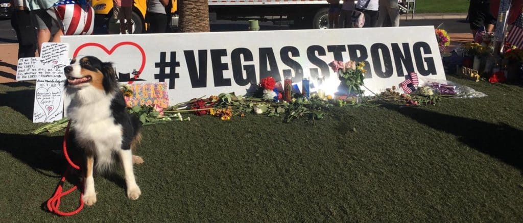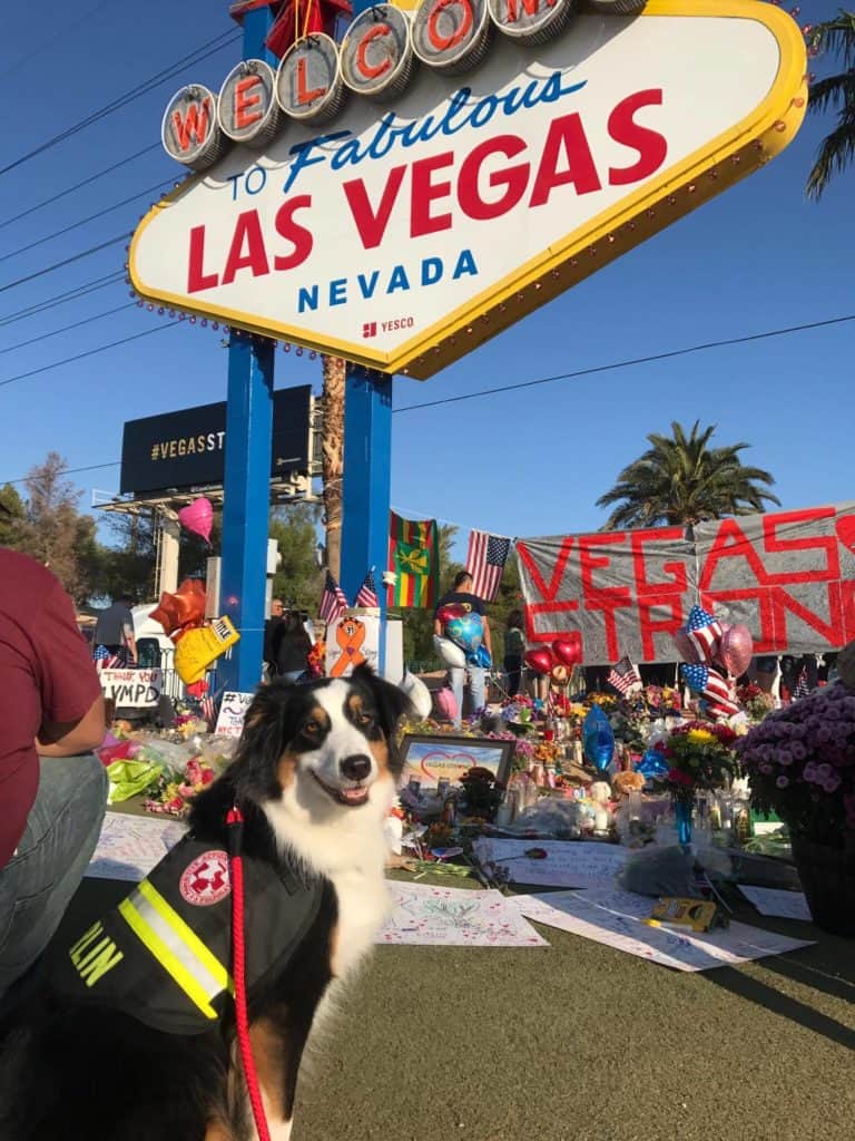 “On our trip to Vegas, Merlin kept going to a firefighter who stood away from the group. When asked by the fire peer support member if anyone had been affected directly, this firefighter denied any direct effect but then went on to say a family member had tickets to go but didn’t attend. The family member’s friend had gone without her, and the friend had suffered a tremendous loss. It made me realize how empathetic Merlin was, and how he was helping this firefighter as the firefighter continued to pet him.”