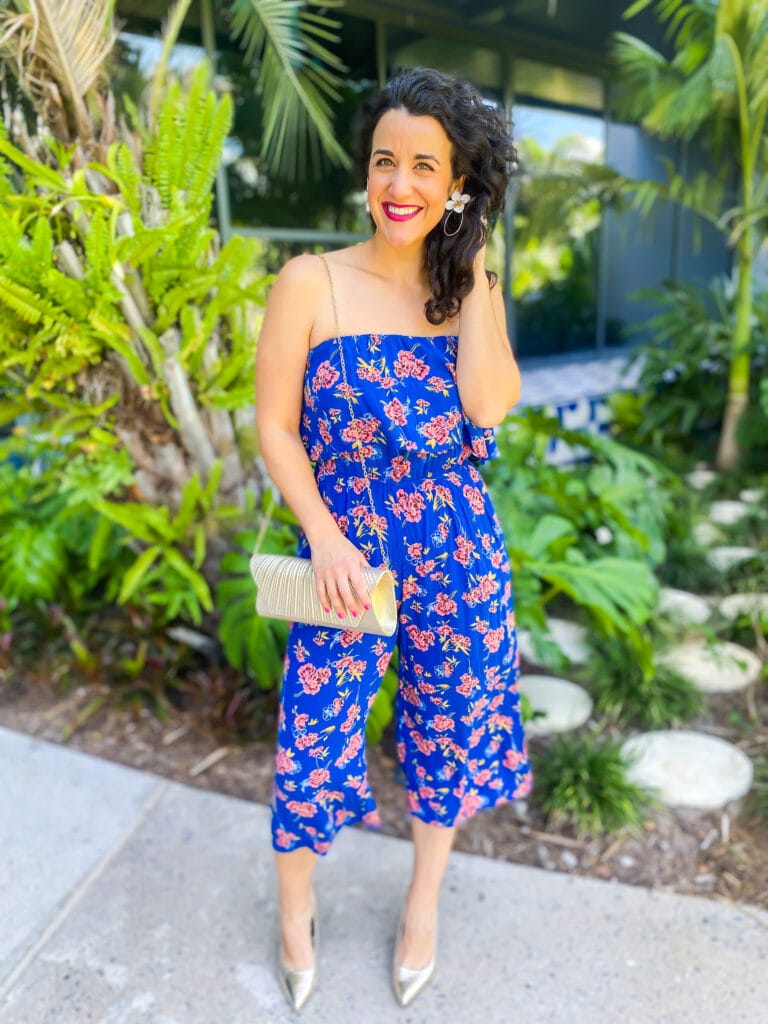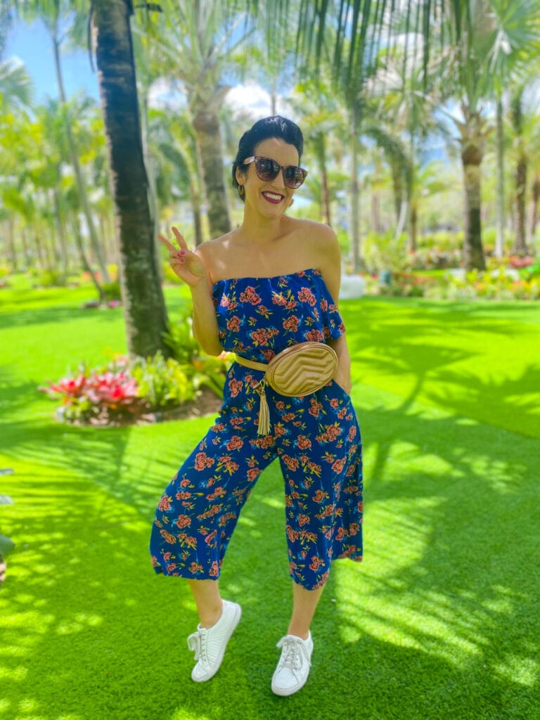 I love a lightweight jumpsuit because you can squeeze so many outfits out of this one piece. Dress it up for a dinner out on day one, wear it as your “around town” look on day two, then use it as your swimsuit cover up for the rest of the trip! Add nice jewelry and an evening clutch for your dinner plans. Then pair it with your suit, hat and sandals or belt bag and sneaks for a quick and easy daytime look. (See the strapless, floral version styled for both day and night.)